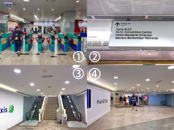 まずはLRTのピンク色5番、クラナ・ジャヤ線(KELANA JAYA LINE)のKLCC駅で降ります。改札が2箇所あるので、券売機と向き合っている改札の方から出ます。頭上の案内板に“Suria KLCC”と表記があるので、改札を出て迷われた場合はその案内板を見つけると行きやすいです。そこからは道なりに進むと入り口が見えます。