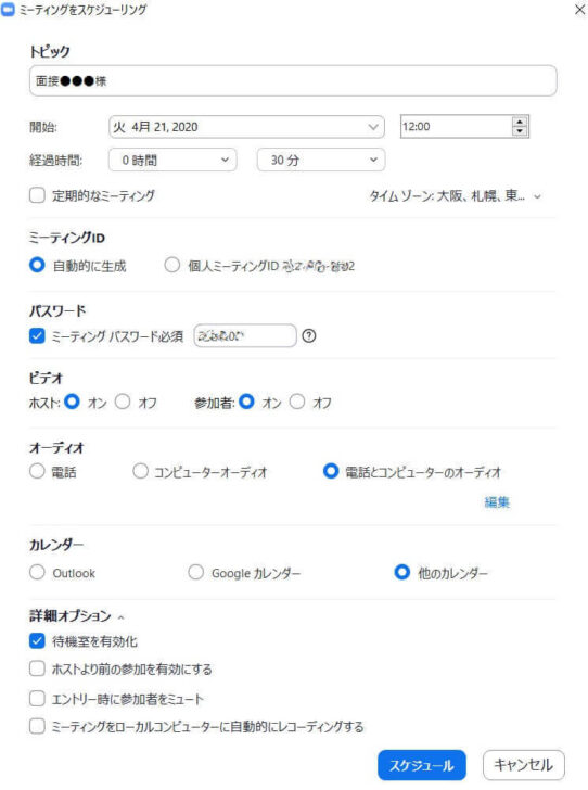以下の画面に切り替わるので、ミーティングの日時など詳細を設定します。