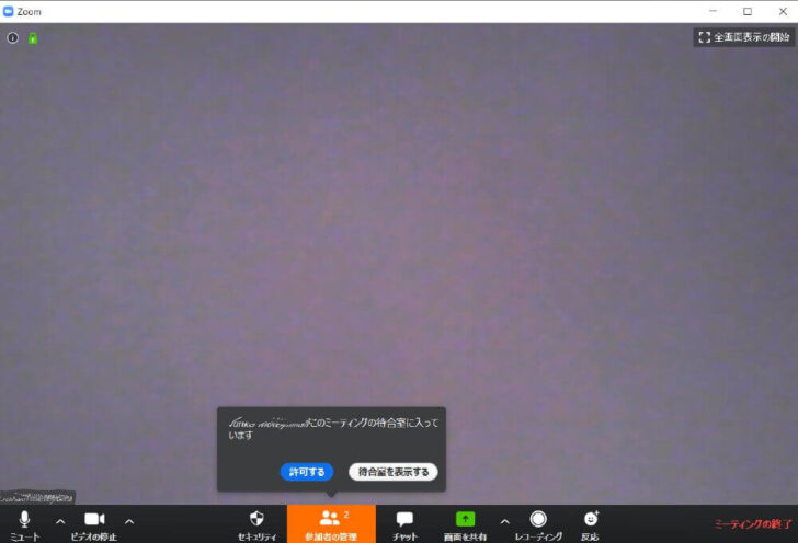 立ち上がった画面下部の「参加者を管理」に、参加者が待合室に入っていると表示されたら、「許可」をクリックして ミーティング をスタート。