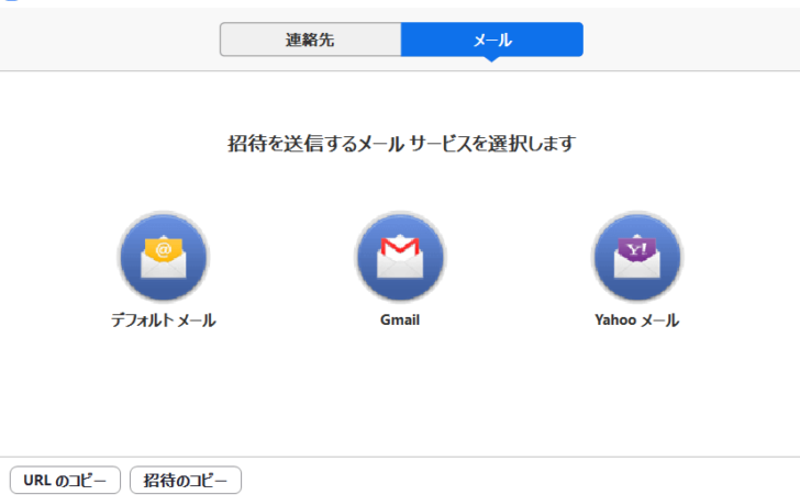 参加者をミーティング に招待するための連絡方法が表示さるので、使いやすいものを選択。
