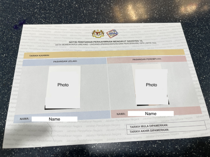 マレーシアでは書類提出日=結婚日とはならず、書類を全て提出後、21日間掲示板に2人の情報をのせ、結婚への反対者がいなければ無事に結婚の登録式?のようなものが行え、晴れて正式に結婚の成立となります。