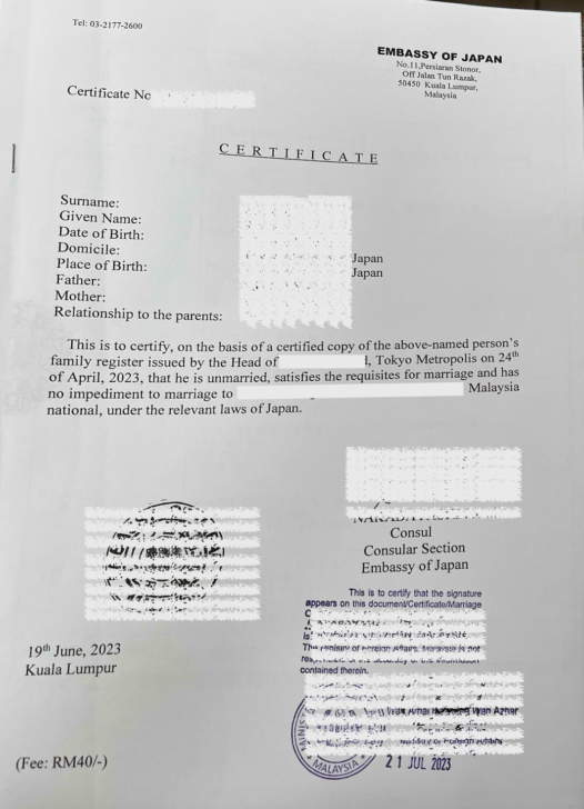 ①在マレーシア日本国大使館にて婚姻要件具備証明書を取得