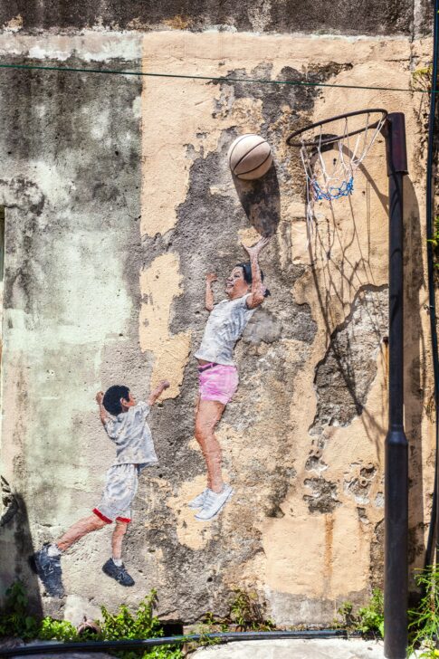 最後にこちら。バスケットボールをしている子どもたち。この躍動感には思わず目を奪われてしまいます。他にも様々なウォールアートがあるので、お気に入りのものを見つけてみてはどうでしょうか。